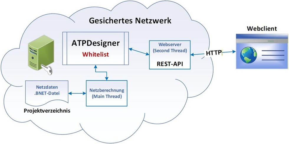 ATPDesigner stellt einen Webservice mit Diensten zur Netzberechnung (Services) zur Verfügung, die über Internet oder Intranet mit Hilfe eines REST-API genutzt werden können. Zur Realisierung des Webservice ist in ATPDesigner ein Webserver integriert.
