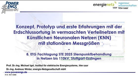 Konzept, Prototyp und erste Erfahrungen mit der Erdschlussortung in vermaschten Verteilnetzen mit Künstlichen Neuronalen Netzen (KNN) mit stationären MessgrößenVortrag zuur 8. ETG Fachtagung STE 2025 Sternpunktbehandlung in Netzen bis 110kV, Stuttgart-Esslingen