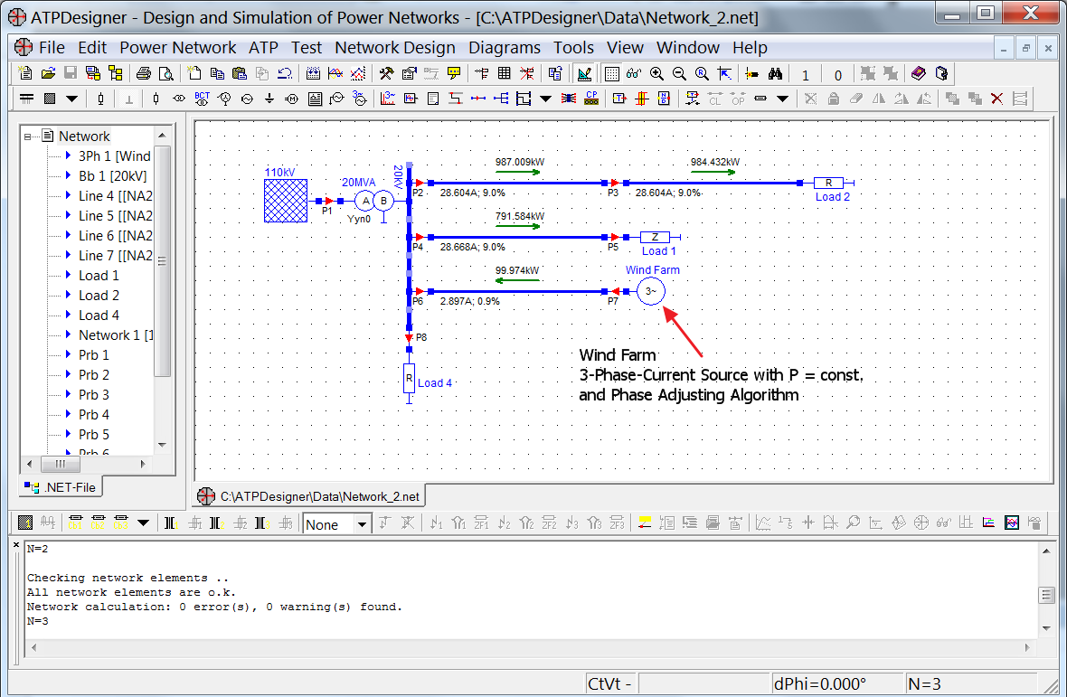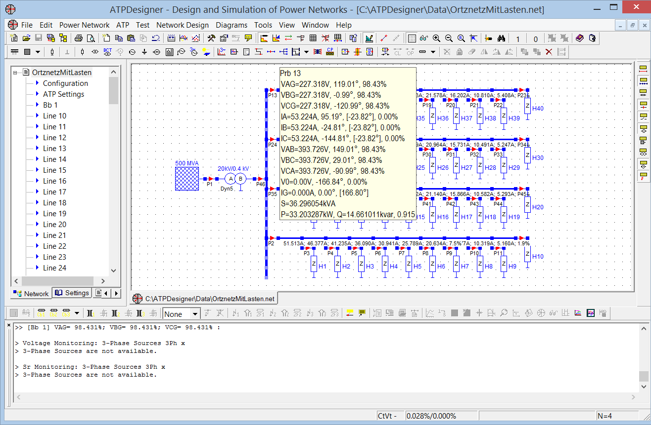 ATPDesigner/ATP ermöglicht die Berechnung stationärer Netzzustände auch mit dezentralen Ernergieerzeugungsanlagen wie Wind- oder Solarparks auf allen Spannungsebenen. Die Ergebnisse der Lastflußberechnung werden in Tooltips und in einem Textfenster dargestellt.