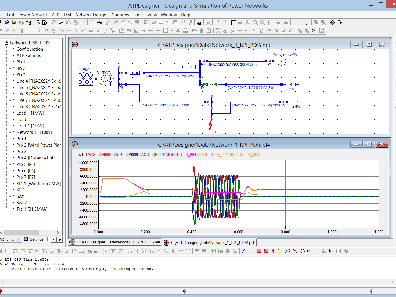 Die besonderen Fähigkeit von ATPDesigner/ATP besteht in der Berechnung dynamischer Netzvorgänge, die z.B. durch Kurzschlüsse oder das fluktuierende Einspeiseverhalten dezentraler Energieerzeugungsanlagen verursacht wird. Diese Modelle sind auch mit den generischen Modellen der Netzschutzgeräte kombinierbar. Damit können komplexe Fragestellungen simuliert und analysiert werden, die sich im Rahmen der die Energiewende z.B. den Netzbetreibern auf allen Spannungsebenen stellen.